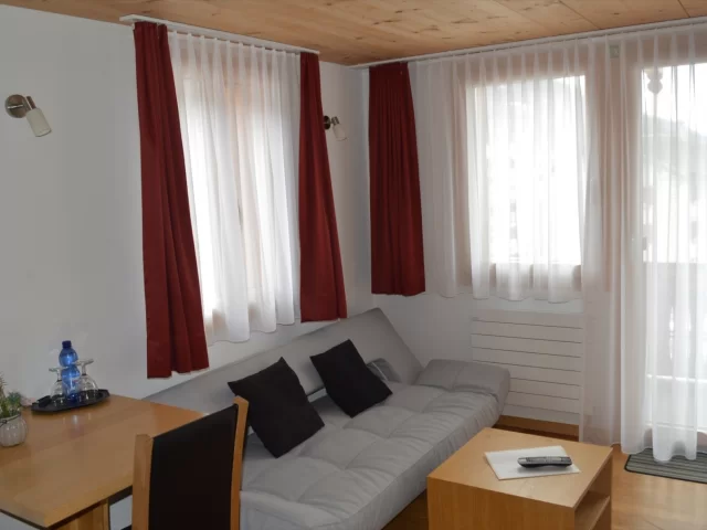 Im Jahr 2010 komplett neu renoviert und möbliert. Grosszügig geschnitten (mind. 32m²). Die zeitgemässe, gleichzeitig heimelige Einrichtung verströmt dank Massivholz ein Gefühl von modernem Komfort und Geborgenheit. Ausstattung: Dusche, Toilette, Fön, TV/Radio (LCD), Sofa, gratis W-LAN, Safe, Balkon zur Süd- und/oder Westseite.